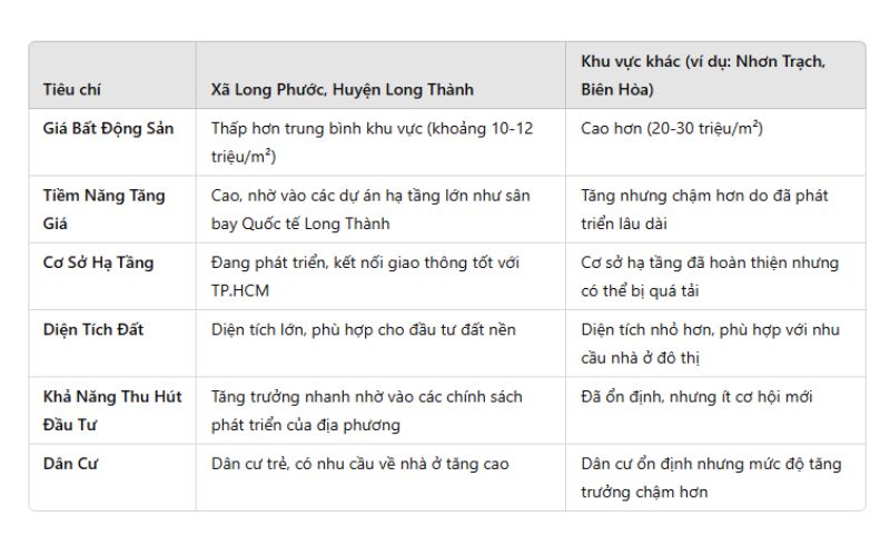 Tóm lại, với các yếu tố hạ tầng, giao thông, nhu cầu cư trú và dịch vụ ngày càng gia tăng, Long Phước, huyện Long Thành, đang trở thành điểm sáng đầy triển vọng trên bản đồ bất động sản khu vực phía Nam. Đầu tư vào Long Phước không chỉ là cơ hội ngắn hạn mà còn hứa hẹn tiềm năng tăng trưởng dài hạn khi sân bay Long Thành chính thức hoạt động.