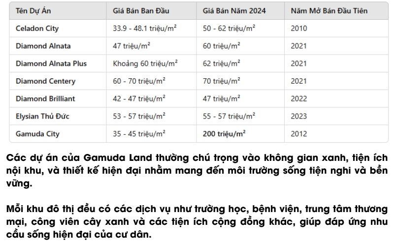 Dưới đây là danh sách mở rộng các dự án của Gamuda Land tại Việt Nam, với thông tin về giá bán ban đầu, giá bán hiện tại, năm bắt đầu bán và tình trạng pháp lý ( Tham Khảo ) :